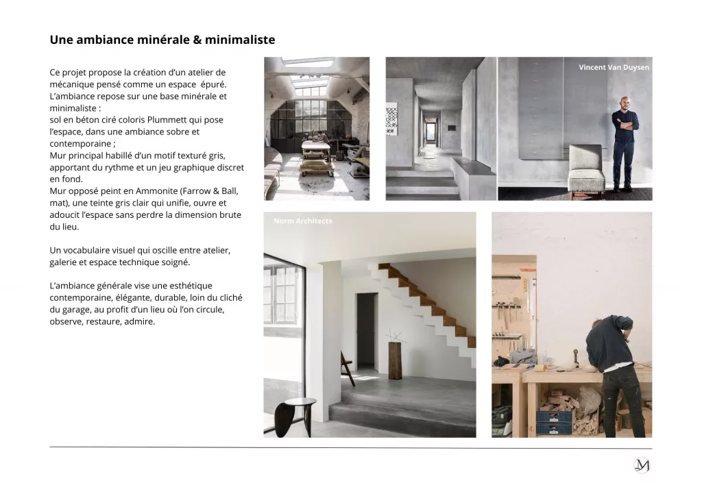 Ou, à l’inverse, il peut se transformer en atelier-galerie, minimaliste, structuré, inspiré des architectes contemporains : béton clair, grahiques avec des effet de matière..